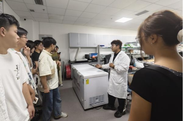 随后,新生们在师兄师姐的带领下有序进入实验室实地参观。各实验室负责人详细介绍了各种实验仪器的功能与应用场景,并分享了科研成果背后的科研故事,强调了严谨求实的科学精神和持之以恒的探索过程。同学们聆听讲解时神情专注,对科研人员的敬业精神表现出由衷的敬佩。